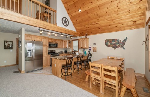 Montez les marches et entrez par l'entrée du niveau principal. Vous trouverez une grande salle spacieuse avec un coin salon confortable autour de la cheminée, un grand mur de fenêtres et un plafond voûté. La cuisine ravira tous les chefs et dispose d’un bar à côté de la belle salle à manger avec de nombreux sièges pour tous les goûts. Deux chambres et une salle de bain complète finissent le niveau principal. Montez les escaliers uniques menant au loft donnant sur la grande salle pour trouver une retraite privée avec une luxueuse baignoire �� jets dans la salle de bain complète. Le niveau inférieur s'ouvre sur une charmante salle de loisirs avec une table de billard pour que tout le monde puisse en profiter. Avec deux chambres suppl��mentaires et une salle de bain complète, chacun peut s’échapper. Pour rendre vos vacances spéciales, cette maison offre un centre de blanchisserie à domicile, la climatisation centrale, un accès Internet Wi-Fi, l'utilisation d'une imprimante et d'un scanner sans fil, Netflix illimité et DirecTv NFL Sunday Ticket!