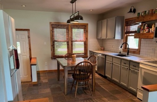 Clean quiet ranch with hard wood floors and slate. Large living room with 60" TV. Large, Clean bathroom with an additional sink in basement. Within walking distance of several bars and restaurants. Has dishwasher, toaster, microwave, stove, fire pit, A/C and heat. Everything you need for a comfortable stay.