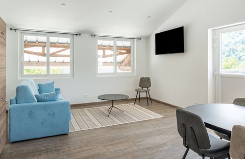 - A 35 m² living room with TV, a sofa bed and a dining area.