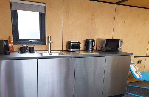 Beautiful newly refurbished contemporary studio with king-size bed, kitchenette with Nespresso coffee, kettle, toaster, microwave and single induction plate and a selection of teas, snacks and condiments for cooking.