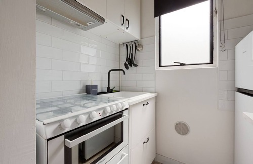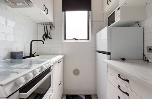 The kitchen is equipped with an oven, a stovetop, and a refrigerator, as well as a microwave and cookware. Bathroom amenities include a hair dryer and a bidet. Other amenities at this 1-bedroom, 1-bathroom rental include bed sheets, air conditioning, and heating.