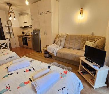 Situé à Borovets et offrant une vue sur la montagne, l’hébergement Cozy Studio in Semiramida Gardens - Borovets Hills 39 comprend un jardin ainsi qu’une piscine privée. Cet appartement possède un parking privé gratuit et se trouve dans une région où vous pourrez pratiquer des activités telles que la randonnée et le ski. Bénéficiant d’une connexion Wi-Fi gratuite, cet appartement comprend une télévision à écran plat par câble, ainsi qu’une cuisine avec un réfrigérateur et un four. Des serviettes et du linge de lit sont mis à votre disposition. Cet établissement dispose d’une aire de jeux pour enfants. Un service de location d'équipement de ski est disponible sur place. Vous séjournerez à 46 km de ce lieu d’intérêt : Gate of Trajan. L'aéroport le plus proche (Aéroport de Sofia) est à 98 km. Un service de navette aéroport payant peut être assuré par l’établissement.
