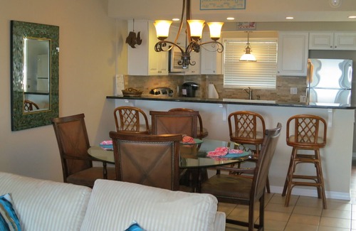 Notre endroit préféré est le patio .... les sièges pivotants hauts vous offrent une belle vue sur l'océan. Vous pouvez vous promener à l'arrière et être sur la jetée, à la piscine ou sur le chemin de la plage. Essayez de vous rattraper au moins un matin pour regarder le lever du soleil et chercher des dauphins.