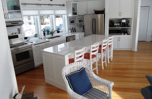 La détente continue à l'intérieur de la grande salle de la maison de plage avec ses fenêtres sur la mer des Salish (alias Puget Sound), ses couchers de soleil spectaculaires, son grand foyer à gaz et sa belle cuisine gastronomique entièrement rénovée et entièrement équipée avec comptoirs de quartz et appareils SS modernes. Appréciez la préparation des repas dans la vraie cuisine d'un cuisinier qui va bien au-delà des principes de base et qui comprend tous les petits et gros appareils électroménagers et l'équipement dont vous avez besoin pour préparer vos aliments préférés.