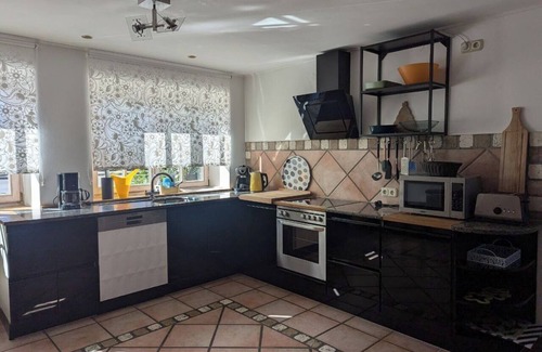 Grand salon (75 m²) avec, une cuisine ouverte moderne avec équipement complet (vaisselle pour 12 personnes, plaque vitrocéramique, four, lave-vaisselle, réfrigérateur / congélateur). Grande table à manger avec des sièges pour 8-10 personnes, salon spacieux avec télévision, station de musique, couchage supplémentaire pour 3 personnes, carrelage avec chauffage au sol, cheminée, salle de bains avec machine à laver, d'un accès Internet sans fil disponible.