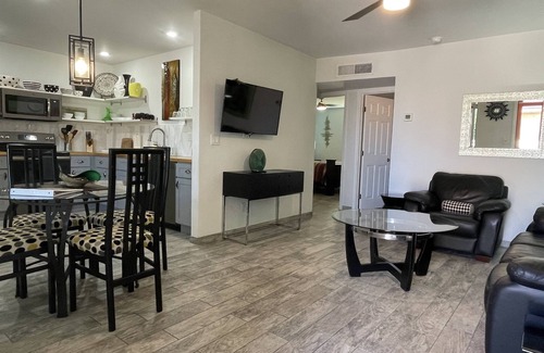 Desert Morada est notre nouvelle propriété. Situé en ville près du centre commercial Tucson. Desert Morada est composé de 12 duplex de jardin autour d’une piscine rafraîchissante. Casita E est 850 pieds carrés et rénové dans un style contemporain avec 2 chambres, une salle de bain avec baignoire et une buanderie séparée donnant sur la piscine avec les montagnes de Catalina au loin. Chaque casita est équipée d'une télévision intelligente à écran plat de 42 pouces avec accès au câble et wifi haut débit. La cour arrière clôturée est accessible par l'une des portes coulissantes en verre de la chambre. Autre là, vous trouverez un patio avec mobilier de jardin sous une canopée d’arbres de mesquite. La casita est entièrement meublée avec draps, serviettes et serviettes de plage pour la piscine. Le parking est sur place et sécurisé. Vous recevrez une télécommande pour votre véhicule afin que vous puissiez aller et venir avec facilit��. La porte de sortie s'ouvre automatiquement lorsque vous vous en approchez. Toutes les casitas acceptent les chiens, mais doivent être approuvées à l'avance. Des frais de 5 USD par animal et par jour sont requis. Nous n'autorisons pas les autres types d'animaux domestiques.