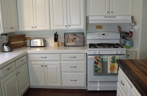 The kitchen is charming, and fully equipped, with gas oven/range, fridge with ice and filtered water, and garbage disposal. We even have new small appliances like a coffee pot, blender, toaster, Crock-Pot; also, a knife block, cutlery, glasses, and pots and pans, help to ensure a home-away-from-home experience.