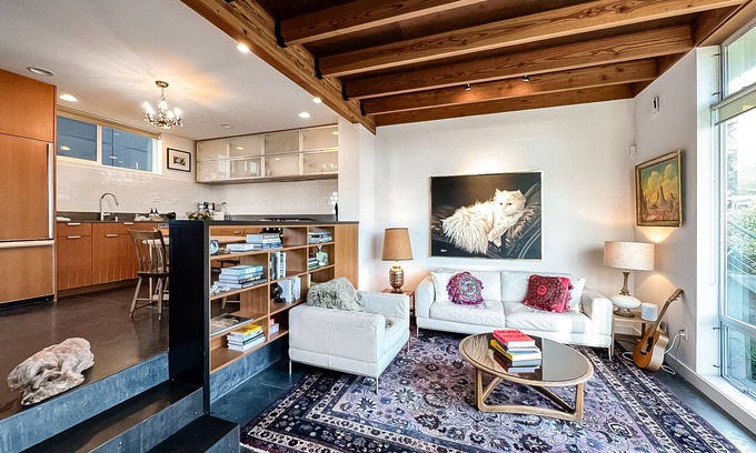 Upon entry, you'll be met with a bright interior and a cozy atmosphere throughout the well-appointed living area. Relax and make yourself at home by resting on the plush furniture, streaming your favorite shows on the large TV, reading a book from the bookshelf, or carrying on great conversation among the artful decor. Marvel at the integrally colored concrete floors with ambient heat, folded plate metal steel stairs linking three distinctly different but equally comfortable floors, art, chandeliers, antique rugs, and a mix of vintage and modern furnishings that promise comfort, whimsy, and an inspired stay. Create culinary charms in the warm wood kitchen, equipped with stainless steel appliances and a circular dining table. A dedicated workspace with a desk and chair is available for those who need to bring their work to Seattle. Two comfortable beds are available with luxe linens to help you get a well-deserved night's rest. The primary bedroom occupies the entire third floor with direct access to the roof deck, boasting soaring ceiling heights, a stunning chandelier, and spectacular views of the valley beyond. This townhouse setting is perfect for sweet Pacific Northwest dreams.