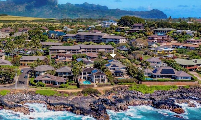 This beautiful 7 bedroom for 14 oceanfront pool home is only 75 yards to famous Brenneckes Beach! Enjoy uninterrupted sunrise and sunset views from your oceanfront pool and jacuzzi. Enjoy the playfulness of breaching whales and spinner dolphins by day and the quiet calm and breathtaking stargazing that only Kauai could provide at night. The main home is a five-bedroom paradise, beautifully decorated with one-of-a-kind artwork created by the owner. Lush landscapes, ocean scenes, and tastefully done Kauai photos will keep you busy for hours as you wander room by room to see the next piece of art. For maximum comfort, this home provides two king beds, a queen, and two full-size beds. Three bedrooms downstairs with the kitchen, living room, and dining area opening to the ocean. Two master suites upstairs offer tranquil views with their very own en-suite bathrooms. Across the little garden retreat filled with fragrant lemon trees, you will find the tastefully decorated two-bedroom guest quarters. Complete with a queen-sized bed in each bedroom of the two bedrooms, relax comfortably and enjoy the epicurean kitchen and fine finish work. With seven bedrooms and four baths total, this multi-level home with guest home is sure to house your entire group comfortably. The ultimate luxury getaway home!