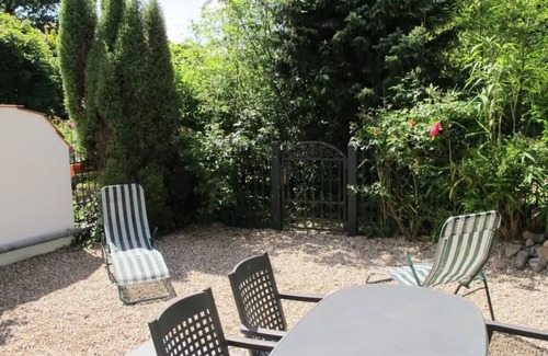 The quiet garden is equipped with a garden lounger, garden table and 4 chairs.