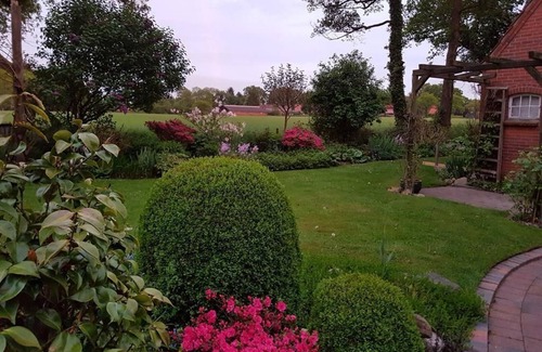 MOIN in Rhodoland Ammerland Le Landhaus Westerlo est situé dans le paradis des cyclistes et des cyclistes, Ammerland, à proximité du Zwischenahner Meer et de la côte de la mer du Nord. Nous proposons deux appartements accessibles aux personnes à mobilité réduite, dotés de sommiers à ressorts réglables électriquement et de deux appartements à l'étage. Les appartements sont équipés d'une douche à effet pluie tropicale, d'une cuisine équipée et d'une grande télévision connectée. Nous avons terminé la construction de ces appartements à la fin de 2017, ils sont situés dans un nouveau bâtiment situé dans une ancienne ferme, dans un bel environnement rural. Le bâtiment est une construction �� ossature bois verklinkerter et est chauffé par un plancher chauffant, nous avons donc ici un cadre de vie très agréable. Les fenêtres sont à triple vitrage et nous avons mis un accent particulier sur l'isolation phonique afin que vous puissiez bien vous reposer ici. Le parking est en face de la maison et il y a une buanderie. Pour les activités de loisirs, notre région offre une variété de possibilités, mais si vous voulez passer la journée ici, vous aurez la possibilité d’utiliser la cabane de barbecue et le magnifique jardin donnant sur les prairies. Directement dans le complexe du bâtiment se trouve une pratique naturopathique, où ils ont la possibilité de faire quelque chose pour leur santé. www. naturheilpraxisschnitger. de