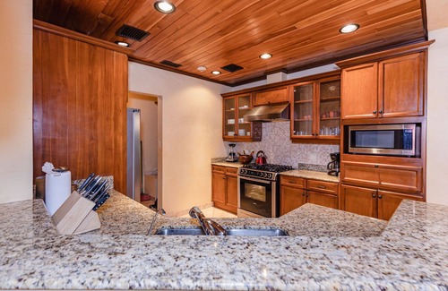 Notre maison de 1500 pieds carrés comprend le meilleur de tout: air central, plafonds en teck et boiseries, sols en travertin calcaire, meubles costaricains fabriqués sur mesure, plans de travail en granit. C’est une maison avec des appareils de cuisine Bosch, des ustensiles de cuisine Williams-Sonoma et des draps de luxe à 600 fils.