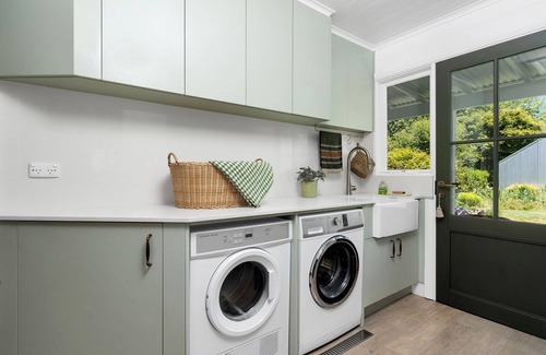 Gardeners Cottage is set on one level with two living areas, one with an open fireplace. The kitchen and dining room are open plan and a combustion fireplace makes this space warm and cosy in winter. The main living area is light filled and has a smart TV.
