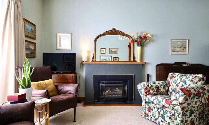 The living spaces are tastefully decorated, showcasing period details like classic wooden finishes and vintage accents, alongside modern conveniences such as a cozy gas fireplace and a fully equipped kitchen. The laundry room includes a washer, dryer, and ironing facilities, catering to extended stays or busy families. Step outside to the fully fenced backyard, a private haven for kids and grown ups to enjoy a sunny picnic lunch.