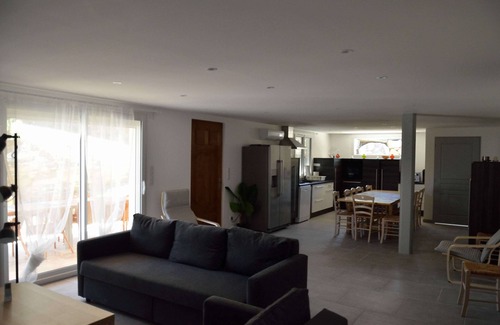 Grande maison, neuve spacieuse, climatisée, située dans un endroit calme, à 2 km du super marché et de la rivière, et à 30 minutes des gorges de l'Ardèche et de Vallon pont d'Arc comprenant 5 chambres ( une avec un lit en 160 + un lit en 90, une autre avec un lit en 160 + un lit en 90 et les 3 autres avec chacune 2 lits en 90), avec toutes une salle d'eau Total 12 couchages. Un grand séjour avec TV, grand écran et 2 canapés-lits. Une cuisine équipée avec frigo américain Une buanderie, 2 toilettes plus une autre à l'extérieur, un sauna, un jacuzzi, un ping-pong, une piscine privée chauffée sans vis à vis (ouverte du 1er mai au 30 septembre). une cuisine d'été, un parking privé, terrasse avec un salon jardin et 2 barbecues. wifi possibilité d'utiliser des vélos gratuitement idéale pour passer des vacances en famille ou entre amis Le linge de lit est compris dans la location à la semaine pour 10 personnes. Pour les weekends possibilité de le louer (6 euros par personne)