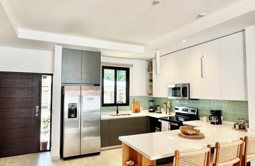 The villa is ideally located only a 5-minute walk from both the beach and the vibrant main strip of Playas del Coco. In town, guests will find multiple supermarkets for convenient grocery shopping, as well as a wide variety of restaurants offering everything from Italian cuisine and wood-fired pizza to burgers and local dishes.