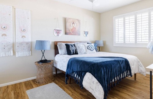 Our single story home is simple and comfortable featuring 3 bedrooms and 2 full bathrooms with a authentic Southwest with a dash of Sante Fe feel. The kitchen has what you need to prepare your meals including a cooktop stove/oven, microwave, refrigerator, dishwasher, toaster, traditional and Keurig coffee maker, cookware and kitchen utensils. There is a kitchen table for 4 plus 2 additional chairs. You will also appreciate the convenience of the work station located just off the kitchen for all those "digital nomads" & "work from anywhere professionals". The family room is as you walk in the door and has a sofa, 2 chairs, and a 65” Smart TV (streaming services only).