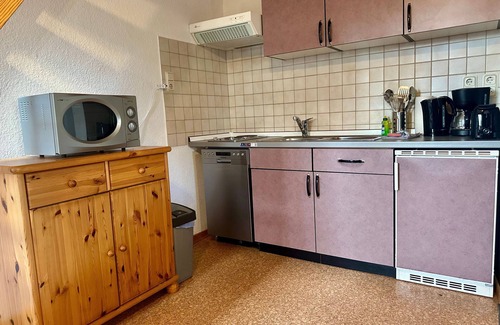 Equipement Appartement au rez-de-chaussée: * petit vestibule * sortie de la salle de bain avec douche, WC, lavabo * salle de séjour avec cuisine ouverte, canapé confortable, coin repas, sortie satellite sur la terrasse aménagée * cuisine avec plaque de cuisson vitrocéramique et four, lave-vaisselle, four micro-ondes , Grille-pain, cafetière, bouilloire, divers plats * 2 chambres séparées avec un lit double et une armoire, une chambre séparée du couloir et une autre chambre donnant sur le salon attenant séparé avec Lammelentür. * 1 chambre pour enfants du salon accessible avec un lit supplémentaire Services Appartement à l'étage supérieur: * L'appartement est accessible par un escalier extérieur. L'entrée est une petite terrasse meublée en face. * Entrée avec un petit hall d'entrée * Séjour avec cuisine ouverte, coin salon confortable, satellite V * kitchenette avec cuisinière à 2 plaques, réfrigérateur, four micro-ondes, grille-pain, bouilloire, cafetière, divers Plats * bain avec Douche / WC * 1 chambre séparée au même niveau avec lit double et armoire * Un escalier raide dans le salon mène au loft aménagé, voici une autre chambre avec lit double, deux lits séparés, un bureau et une armoire. La cession par cinq personnes est possible Cot! Des places de parking sont disponibles sur la propriété!