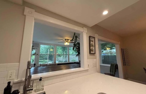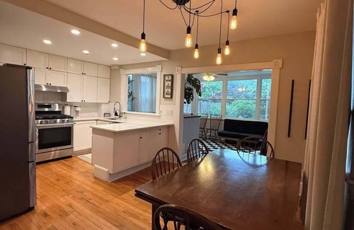Welcome! Our house is designed to make you feel like a home away from home with cozy living areas. Congregate with family and friends between the front living room, breakfast nook off the kitchen and rear, airy sunroom overlooking the backyard. This is a three-bedroom home, sleeping arrangements include a king bed in the primary suite and queen beds in both the 2nd and 3rd bedroom. Whether you're planning to enjoy a hot cup of coffee or grill up your dinner, our back patio includes a sitting area, string lights and BBQ grill with utensils.