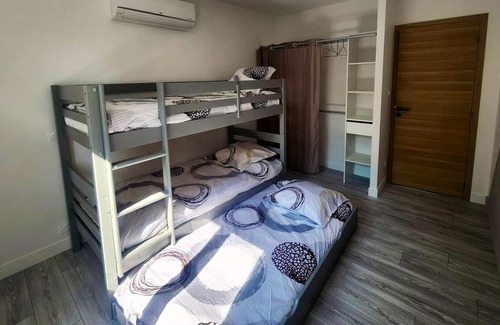 The house has 3 comfortable bedrooms, 2 including a double bed and 1 including a single bed and a bunk bed. The bathroom is fitted with a shower. A separate toilet is available