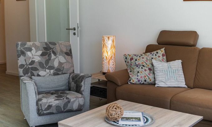 Description de l'appartement: House Baltic Cube, Seestrasse 30, Appartement 6, Wi-Fi gratuit disponible Situation: Situé à seulement 500 mètres de la mer, cet appartement récemment construit (2018) est situé au premier étage et peut accueillir 4 personnes, ainsi qu'un lit bébé. L'appartement d'environ 78 mètres carrés est moderne, de style méditerranéen. Il est un appartement non fumeur et les animaux ne sont pas admis. L'appartement de 3 chambres meubl��s avec goût dispose de 2 chambres séparées, une salle de séjour avec cuisine ouverte, une salle de bains avec douche de plain-pied, un balcon avec mobilier de jardin et un parasol dans l'orientation sud-ouest. Vous pouvez vous garer directement en face de la maison objet Cube Baltic sur l'appartement appartenant à la place de parking n ° 6, a également son propre local à vélos. Le salon lumineux et décoré avec goût, vous trouverez un canapé confortable avec des fauteuils et une grande correspondant à table à manger, qui confortablement pour quatre personnes, pour rester. Elles comprennent également une télévision à écran LED, un lecteur DVD et un petit système stéréo. À droite sur le salon, le balcon est dans une direction sud-ouest. Profitez d'un petit-déjeuner tranquillement dans un soleil matinal agréable ici. A côté de la surface habitable, l'appartement dispose de 2 chambres séparées. Dans la grande chambre, vous trouverez une autre LED TV, un lit double (1,80 x 2.0m) et une grande armoire. La deuxième chambre dispose de deux lits simples, un bureau et un autre placard. Les chambres offrent assez d'espace pour un lit et peut facilement être obscurci par des volets, en plus est une petite LED TV. La cuisine est entièrement équipée d'un lave-vaisselle, un réfrigérateur, un congélateur, un four, une plaque vitrocéramique, grille-pain, cafetière, bouilloire et micro-ondes. La vaisselle et les verres sont disponibles en nombre suffisant. Livres et jeux de société sont également dans l'appartement. La salle de bains lumineuse avec fenêtre et douche au niveau du sol a une armoire de salle de bain mural, un lavabo avec un grand miroir, un miroir grossissant, d'un sèche-cheveux et sèche-serviettes. chauffage par le sol pour la chaleur et le confort fait dans toutes les chambres de l'automne et les jours d'hiver. La buanderie privée dans l'appartement dispose d'une machine à laver et sèche-linge avec une planche à repasser et fer à repasser. lit Voyage payant, jeux de chaise haute et le linge peut être réservé. Fixer le droit à une des chaises de plage convoités pour réserver à des tarifs spéciaux (EUR 7, - par jour, EUR 40, - par semaine).