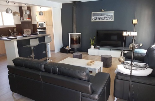 La villa se compose de 3 belles chambres (2 avec lit double et 1 avec 2 lits simples), une salle de bain, un grand sejour salon avec poele à bois.