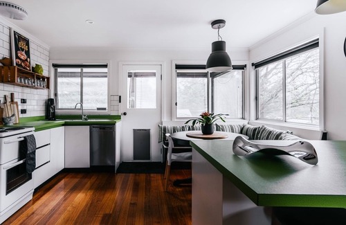 Stepping inside, the sleek monochrome kitchen and dining area are contrasted by statement green countertops, bringing a pop of colour to this space and making it feel cosy but chic. Comfy booth-style seating surrounds the kitchen table, for a casual relaxed vibe when sitting down for a meal or a chat. Bring along your four-legged best friend to enjoy this pet-friendly home, complete with a dog door for inside and outside autonomy! A cosy fireplace and split system heater/air conditioner allow you control over the temperature, perfect for those warmer summer days or cold winter nights. Double rain showers in one bathroom are accompanied by a large, deep bath for the ultimate in relaxation. A 10 seater swim spa in the backyard available for use with a convenient shower/bathroom located close by
