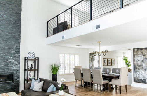 Welcome to L'Amore! An ultra luxe, Desert Italian Contemporary Villa with everything at your fingertips! This home boasts 4300 sq feet of living space, 5 large bedrooms (guest suite on main level), 4 bathrooms on 1/2 acre lot with large pool, fruit trees and mature landscape that sleeps 14 in pure comfort. This spacious, functional home has been spared no cost or thought in creating the ultimate vacation experience. Professionally designed by SG Interiors LLC.