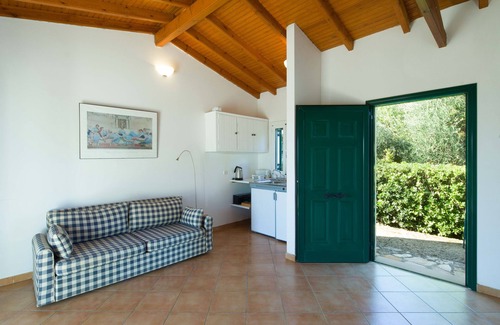 Suivez le chemin du jardin jusqu'à la jolie maison d'hôtes qui comprend une chambre double décloisonnée, un coin salon, une kitchenette et une salle de douche. Le plafond cathédrale magnifique donne une sensation globale d'espace. Deux ensembles de portes françaises offrent un accès direct à la terrasse privée, au solarium avec vue sur la mer et au jardin d'herbes aromatiques nouvellement créé. La maison d'hôtes est un excellent ajout pour les clients souhaitant disposer de leur propre espace tout en étant étroitement liés à la villa.