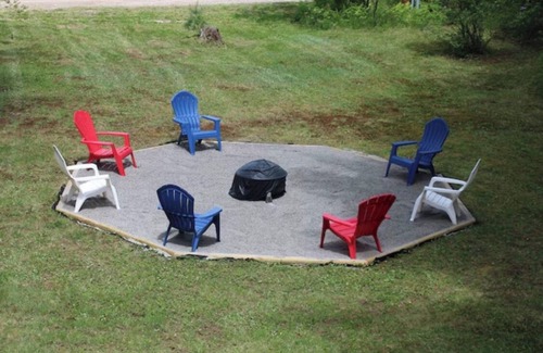 The front lawn offers a fireplace, a large play area, and abuts a quiet dirt road.