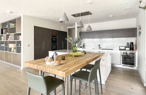 Expansive open plan encompassing kitchen, dining and living room with large gas fireplace and separate media snug. Underfloor heating and MVHR cooling system through-out this property ensures the perfect temperature whatever the weather. Vast wood-floored living and dining areas look out to the lake a view shared by the large premium equipped kitchen. Appliances including Delonghi bean to cup coffee machine, dishwasher, separate large fridge and freezer, wine fridge, Neff steam oven, fan oven & warming drawer. The kitchen also benefits from a zip hydro tap providing instant boiled water & filtered drinking water, a Magimix food processor and Sodastream. The Neff microwave is located within the pantry cupboard. A Neff induction hob with ceiling extractor fan are located in the large central island, everything you need for gourmet living.