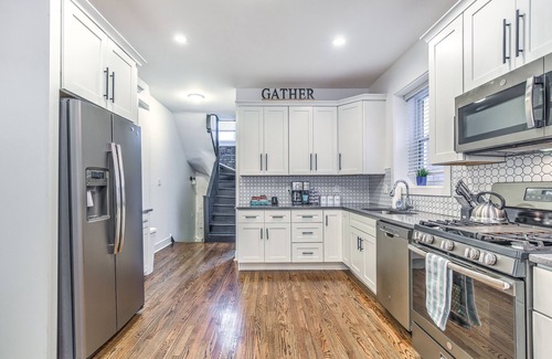 In the kitchen, the gleaming stainless steel appliances, pristine white cabinets, and dramatic patterned backsplash will tempt the family chef into creating culinary delights to share with the group. With abundant counter space and plenty of storage for all your groceries and goodies, that's easy to do here.