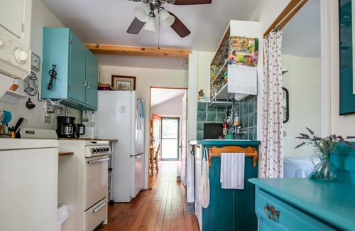Ce charmant chalet Sears à un seul niveau est une confortable chambre à coucher avec deux lits jumeaux et un futon double dans le salon / salle à manger. La cuisine de cuisine a un grand réfrigérateur, petite cuisinière 4 feux, lave-vaisselle, laveuse et sécheuse. Les ventilateurs de plafond sont partout et il y a un radiateur dans le salon pour ces nuits fraîches. Détendez-vous sur la véranda avec des sièges pour six. À quelques pas de Village Green, de la confiserie, des magasins, de la poste et d’autres magasins. Beaucoup de jeux de société, puzzles et livres pour se divertir tout en profitant de la vue sur la cour, Conservancy Dale, et le lac de la véranda arrière.