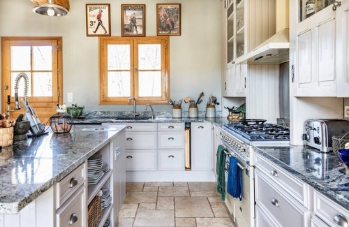 - cuisine avec cuisinière à gaz, four à gaz, four à micro-ondes, lave-vaisselle, réfrigérateur-congélateur, cafetière électrique, bouilloire et grille-pain