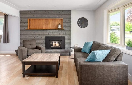 Gas fireplace + TV in the main living room with unlimited WiFi, Amazon Prime Video, TekSavvy TV (Cable, Crave+HBO), HDMI. Basement rec room provides extra living space.