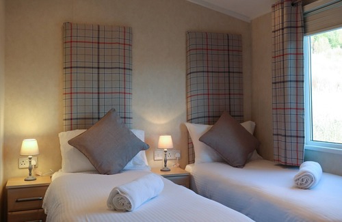 Bathroom: With shower over bath, and toilet.. Calor gas central heating, gas, electricity, bed linen, towels and Wi-Fi included. Travel cot and highchair available on request. Laundry room with washing machine and tumble dryer (shared with other properties on-site).. Small decked area with garden furniture. 10-acre un-spoilt grounds (shared with other properties on-site). Children’s play area (shared with other properties on-site). Private parking for 2 cars. No smoking. Please note: There is an unfenced river in the grounds, 110 yards away.. This two bedroom, detached lodge has spectacular views over the Caledonian Canal and is an ideal base from which to explore this beautiful part of Scotland. The lodge is equipped to a very good standard throughout, including a fitted kitchen with a dishwasher and fridge/freezer, full central heating, free Wi-Fi and a 32" flat screen TV in the living room. The layout of the lodge offers guests stunning views through the glazed gable from the living room overlooking the countryside and the canal. To the rear of the lodge is a master bedroom with an en-suite shower room and a twin bedroom served by a bathroom. Outside there is extensive decking to enjoy those beautiful evenings. Within the grounds there is a shared utility room and a children’s play area.