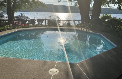 Propriété unique sur le lac Honeoye. 110 pieds de front de mer avec quai et ascenseur à bateaux ainsi qu'une belle plage de galets. Lakehouse entièrement rénové en 2016 pour inclure une cuisine gastronomique ainsi qu'une salle de bains mise à jour. 2 chambres en bas pouvant accueillir 5 personnes. A l'étage a une deuxième salle de bain complète ainsi qu'une grande chambre avec lits superposés pouvant accueillir huit personnes. À l'étage, il y a aussi un vestiaire séparé avec un lavabo et sert souvent de chambre à coucher pour les enfants. Au large de la cuisine se trouve un pont de 450 pieds carrés à quelques pas du lac. La propriété a la seule piscine creusée chauffée sur le lac ainsi qu'un bain à remous et un sauna. Deux espaces de vie séparés, chacun avec sa propre terrasse donnant sur le lac, une pièce avec un poêle à bois et l’autre une cheminée à gaz. Tous les lits ont de nouveaux matelas en mousse à mémoire de forme et les meubles sont tous nouveaux. Deux kayaks pour une personne, un canoë, un voilier laser, un quai, un monte-bateaux et un barbecue au charbon de bois Weber® sont utilisés. Le lac offre une excellente pêche et de magnifiques couchers de soleil.