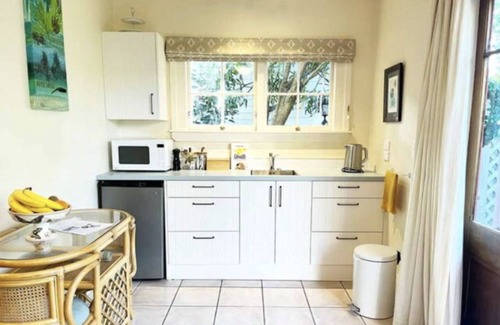 Des portes françaises orientées au nord s'ouvrent sur un jardin magnifique, plein de couleurs et abritant divers oiseaux indigènes de Nouvelle-Zélande. Un échiquier surdimensionné se trouve à côté du chalet. À l'intérieur, la maison d'hôtes est décorée avec goût avec des œuvres d'art locales. Le chalet est sécurisé et chaleureux. Parfait pour les couples ou les célibataires.