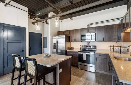 Spacious condo in the heart of downtown featuring a private balcony, cozy fireplace, and all the amenities you need for a comfortable stay. Enjoy a fully equipped kitchen, Wi-Fi, laundry, and stylish furnishings. Walk to restaurants, shops, breweries, and more. Everything is just steps away. Perfect for relaxing or exploring the city!