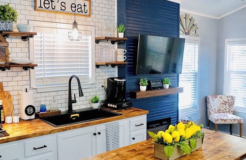 In the brand-new renovated kitchen, you will find a 3-burner gas stove, a microwave, convection oven, air fryer combo that is built-in to the butcher block kitchen island, refrigerator, and a large deep sink. The kitchen is fully stocked with all your cooking needs.