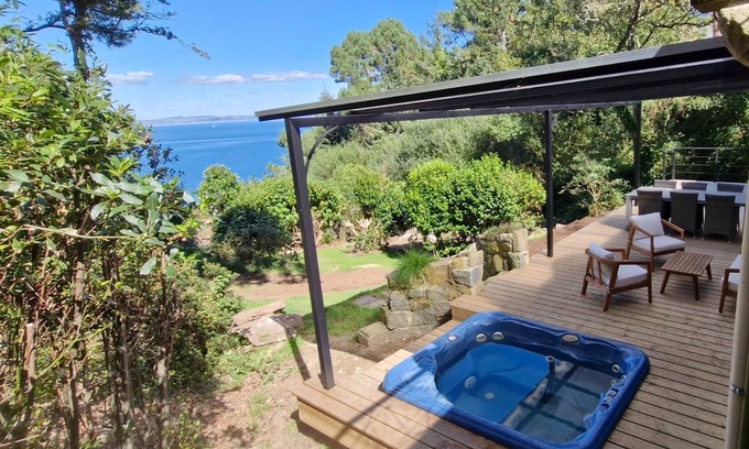 Ce coin de paradis est idéalement situé pour visiter la région et le littoral breton, de la Pointe du Raz à la Presqu'Ile de Crozon que vous apercevrez de la belle terrasse en bois surplombant le terrain ou bien installés dans le jacuzzi profitant d'un temps de repos, berçés par le son des vagues. Le jacuzzi est proposé uniquement pour les séjours de 7 nuits minimum du 1er mai au 10 septembre.