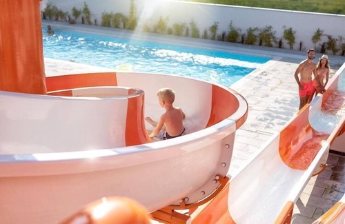 Composition: Rez-de-chaussée: (cuisine ouverte(foyer(2 foyers, induction), bouilloire, grille-pain, micro ondes, combinaison réfrigérateur/congélateur), salle à manger-salon(canapé-lit double, TV(écran plat), table), salle de bains(douche, lavabo, WC, sèche-cheveux)) Au 1er étage: (chambre(lit simple, lit double), chambre(lit simple, lit double)) Reception, Accès Internet, Parking, Glissade D'eau, Bain à bulles, Tennis de table, Terrain multi-sports, Terrain de football, Terrain de volley, Basket-ball, Bar, Espace de jeux intérieur, Aire de jeux, Pelouse, baignoire bébé, lave-linge (payant), balcon, chauffage(électrique), terrasse(privé, couverte), jardin(partagé avec d'autres clients, clôturé, 1,5 hm2), mobilier de jardin, transats, barbecue(partagé avec d'autres clients, charbon de bois), trampoline(partagé avec d'autres clients), piscine(partagé avec d'autres clients, extérieur, chauffable, piscine pateaugeoire (profondeur 50cm), bâche, 14 x 6 m ouvert de Juin jusqu'à (inclus) 1/2 Sept), bac à sable(partagé avec d'autres clients), toboggan(partagé avec d'autres clients), chaise haute, table à repasser, fer à repasser, jeux de société, Balançoire, baby crib(free)