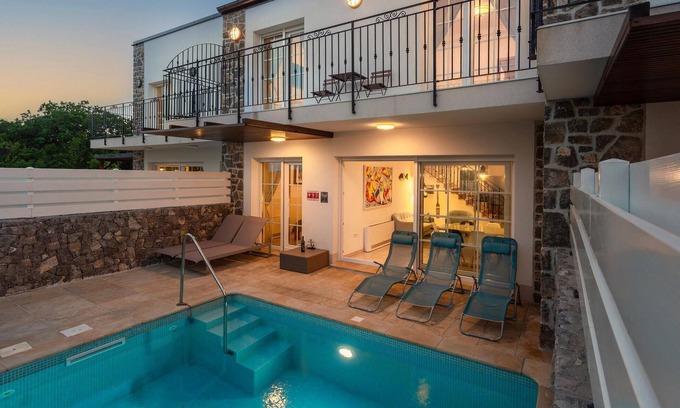 Sur l'île de Krk, dans le petit village de Korni, se trouve cette magnifique maison de vacances avec piscine. Elle se trouve à environ cinq minutes en voiture de la ville historique de Krk et de la ville de Punat avec son port bien protégé. Grâce à sa situation sur une colline, la maison offre une vue fantastique sur la mer et les oliveraies, pour lesquelles la région est connue. La maison, aménagée avec l'amour du détail, est construite selon l'architecture typique de l'île et se compose d'un mélange réussi d'éléments modernes et traditionnels. Depuis le salon, vous avez un accès direct à la terrasse avec barbecue, espace salon et soleil ainsi que piscine chauffée. La chambre à coucher principale se trouve au rez-de-chaussée et les deux autres sont à l'étage. La maison est climatisée, dispose d'un chauffage au sol et sur le grand terrain clôturé se trouvent également les places de parking.
