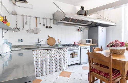 Votre charmante maison de vacances, nichée dans la douce campagne à l'extérieur de Sestri Levante, constitue le lieu de retraite idéal pour plusieurs familles ou un grand groupe d'amis. Elle allie le confort à une touche de style campagnard italien et garantit repos et convivialité. Vous y trouverez des pièces lumineuses et accueillantes qui offrent de la place pour des activités communes. Installez-vous confortablement dans le salon, équipé d'un élégant canapé et de meubles classiques en bois. Pour les activités sportives, une salle de fitness bien équipée est à votre disposition, et un baby-foot vous divertira également. Grâce à l'ascenseur de l'immeuble, vous accédez facilement à l'étage supérieur.