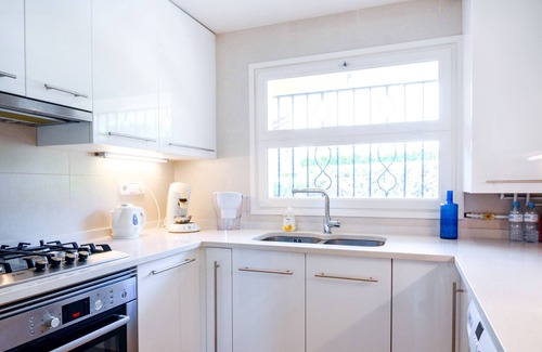 Maison pour 5 personnes avec air conditionné, jardin privé et piscine commune. Situé dans un beau quartier résidentiel, à 5 minutes de la plage en voiture. Toutes sortes de services disponibles à courte distance. L'intérieur de la maison est confortable, bien aménagé et vous vous sentirez comme chez vous. La maison est aménagée en 3 chambres (une avec un lit double, une avec 2 lits simples et une avec un lit simple), salon avec canapé-lit, cuisine équipée, terrasse avec table et chaises et salle de bains avec douche.