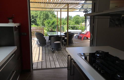 L'ensemble de la zone vie, donnant plein sud, vision forêt, s'ouvre en trois endroits par les baies vitrées à galandage (portes disparaissent dans les murs) d'ouverture de 2.40 totale par panneaux sur une terrasse en bois en hauteur de 70 m2 intégrant 2 zones repas extérieures distinctes, une zone cuisson PLANCHA ainsi qu'une zone détente jaccuzi / spa à 39°. Elle surplombe une seconde terrasse en contre-bas accessible directement par escalier qui elle se compose d'une zone 'bronzette' et de la piscine 10x5 bordée d'un talus arboré.