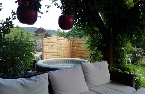Grande terrasse,coin repas ,coin détente avec jacuzzi