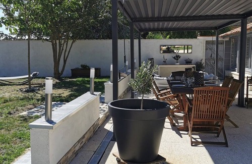 Vous disposez d'un espace plancha, d'un petit salon extérieur fermé idéal pour la lecture à l'ombre et au frais, de tables, chaises et salon de jardin sous pergola pour profiter des repas en extérieur, la journée et/ou le soir grâce aux éclairages. L'hiver le salon cocooning équipé d'une cheminée à l'éthanol et de plaids pour la lecture ou regarder un film sur la télé connectée grand écran. La salle à manger dispose d'un poêle à bois pour complémenter le chauffage électrique et profiter d'un petit feu chaleureux. Une grande cuisine disposant de tout le confort pour l'élaboration des repas (four, micro-onde, lave vaisselle et tous les ustensiles utiles) et équipée vaisselle de qualité donnant envie de déguster et de partager de bons mets. Le gîte a été rénové avec soin en optant et une décoration associant moderne et ancien. C'est une rénovation familiale qui aura duré plus de 2 ans. Tout le mobilier a été chiné et restauré afin de créer une harmonie dans les matériaux, les meubles et déco. L'objectif est de personnaliser au maximum ce lieu afin qu'il vous charme.