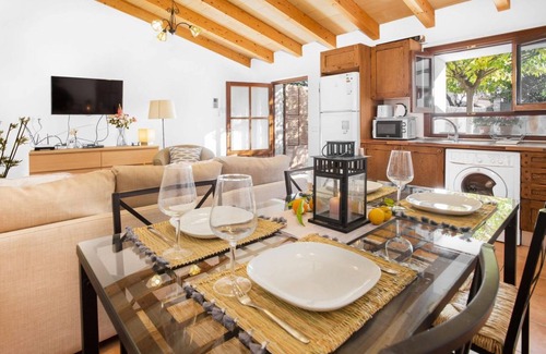 À la périphérie de la ville de Sóller, la maison de vacances Ca'n Doi bénéficie d'un emplacement idéal avec une vue sur les montagnes enchanteresse. Le logement offre un salon confortable avec un canapé-lit pour 2 personnes et des poutres de toit en bois rustiques, une cuisine bien équipée et ouverte, 2 chambres, une salle de bains moderne ainsi qu'une demi-baignoire supplémentaire dans l'espace extérieur et peut donc accueillir 6 personnes. Les équipements comprennent également le Wi-Fi, la climatisation dans toutes les chambres, une cheminée, une télévision LCD avec connexion USB, un lit bébé et une chaise haute. Passez des vacances relaxantes dans l'espace extérieur, où vous trouverez un barbecue, un coin repas, des parasols, des fauteuils de relaxation et une douche extérieure, et laissez le stress de la vie quotidienne derrière vous. L'un des points forts absolus est la piscine, qui vous invite à faire un plongeon rafraîchissant pendant les chaudes journées d'été. Profitez de l'atmosphère méditerranéenne et de la vue sur les montagnes à l'horizon. En raison de son emplacement idéal, vous trouverez un restaurant et un bar à 80 mètres et un café à 120 mètres. La belle plage de sable Platja d'en Repic à Port de Sóller se trouve à 4 km ou à 8 minutes de route de la propriété. Écoutez ici le doux bruit des vagues, bronzez sous le soleil majorquin et passez des vacances uniques avec vos proches !