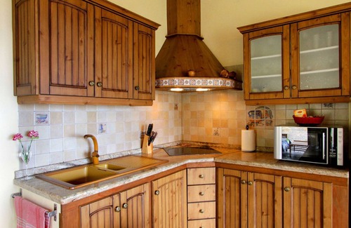 From here you get into the house and directly in the large living room with kitchen - through the large picture windows flooded with light, equipped warm and comfortable. The partially exposed stone walls in most rooms create a special flair. The kitchen is fully equipped, the directly adjoining living area has a comfortable sofa, which can be used as a sofa bed. Radiators provide even on colder days for cozy warmth. If you are looking for entertainment with the TV (Spanish) and Wi-Fi provided. The two bedrooms are furnished with very good mattresses and each a spacious wardrobe, natural stone walls act here almost like painting. The spacious bathroom has a shower with massage jets.